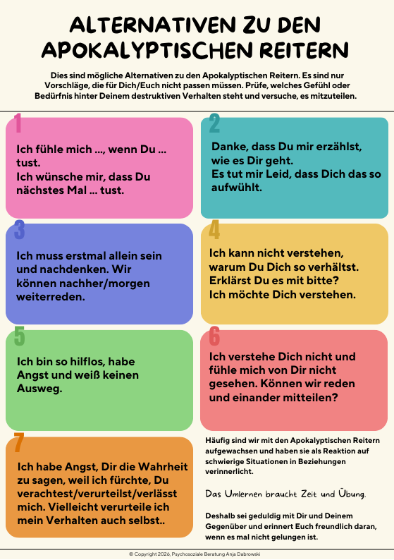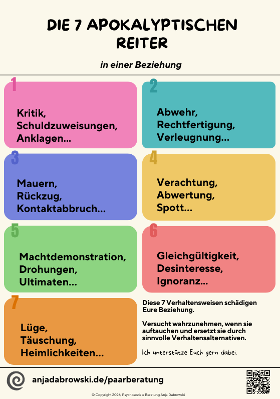 John Gottman nannte 4 Apokalyptische Reiter als sogenannte Kommunikationssünden in Beziehungen. Sie wurden später um drei weitere ergänzt. Du kannst Dir die Seiten gern herunterladen und nutzen. Wenn Du Fragen dazu hast, schreib mir gern.